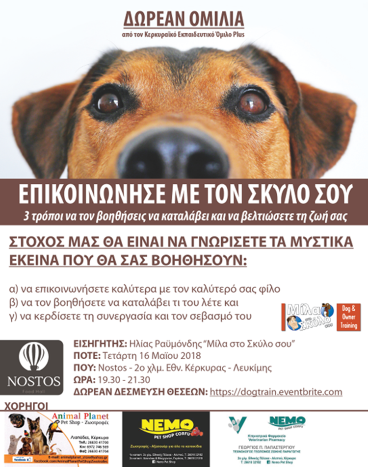 Ο Ηλίας Ραϋμόνδης, ειδικός στην επικοινωνία μεταξύ σκύλων και ανθρώπων, θα παρουσιάσει στην Κέρκυρα την ΔΩΡΕΑΝ ομιλία για το κοινό με θέμα «Επικοινώνησε με τον Σκύλο σου: 3 τρόποι να τον βοηθήσεις να καταλάβει και να βελτιώσετε τη ζωή σας!»