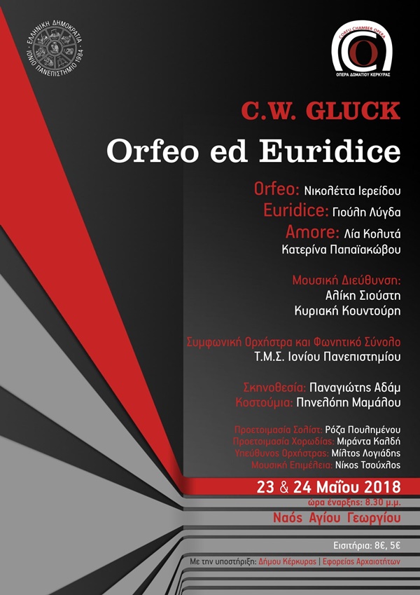 Η Όπερα Δωματίου Κέρκυρας σε συνεργασία με το Τμήμα Μουσικών Σπουδών του Ιονίου Πανεπιστημίου παρουσιάζουν την Τετάρτη 23 και Πέμπτη 24 Μαΐου στον Ιερό Ναό του Αγίου Γεωργίου (Π. Φρούριο) στις 8.30μ.μ. την όπερα του C. W. Gluck «Orfeo ed Euridice».