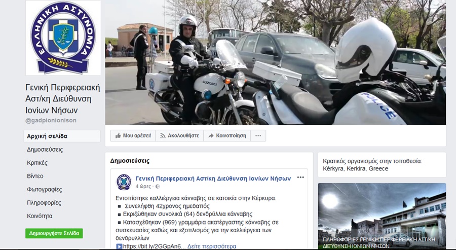 Επίσημη σελίδα στο Facebook απέκτησε η Γενική Περιφερειακή Αστυνομική Διεύθυνση Ιονίων Νήσων, δίνοντας πλέον την δυνατότητα στους χρήστες του facebook, να ενημερώνονται για την αστυνομική επικαιρότητα και να λαμβάνουν χρήσιμες πληροφορίες που αφορούν την καθημερινότητα τους.