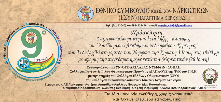 Ο Αχιλλέας Νυμφών, και τα μέλη του ΕΣΥΝ (Εθνικό Συμβούλιο κατά των Ναρκωτικών) και της ομάδας γυναικών Κέρκυρας της ΟΓΕ (Ομοσπονδία Γυναικών Ελλάδας) ετοιμάζονται για ένα εντυπωσιακό κλείσιμο του 9ου τουρνουά ποδοσφαιρικών ακαδημιών Κέρκυρας την Κυριακή 3 Ιουνίου στο πανέμορφο γήπεδο των Νυμφών!