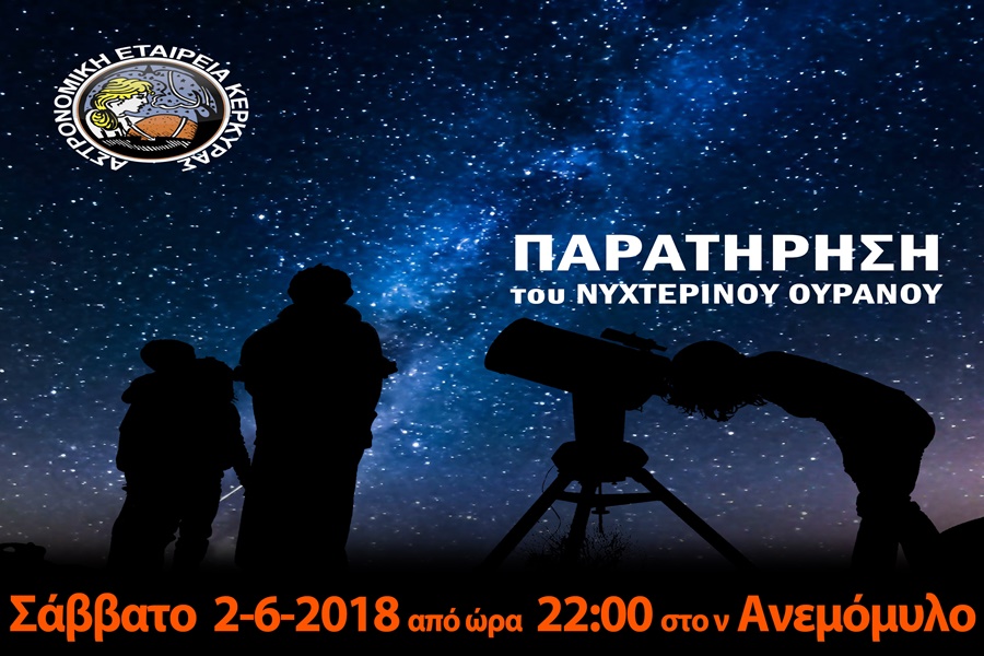 Η Αστρονομική Εταιρεία Κέρκυρας διοργανώνει παρατήρηση του νυχτερινού ουρανού με τηλεσκόπιο το Σάββατο 2 Ιουνίου, από τις 22:00 στον Ανεμόμυλο, όπου μέλη της εταιρείας θα βρίσκονται εκεί για να ξεναγήσουν το κοινό στα μονοπάτια του ουράνιου θόλου.