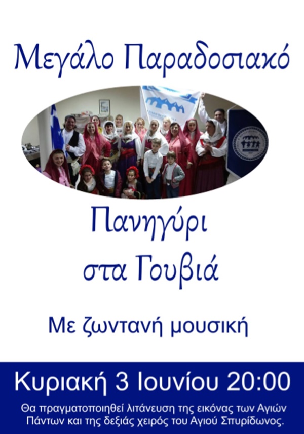 Μεγάλο παραδοσιακό πανηγύρι θα γίνει την Κυριακή, στις 8 το βράδυ, θα γίνει στα Γουβιά.