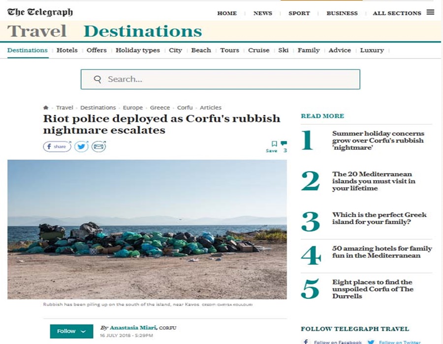 Αποκαλυπτικό, ίσως, για παραμέτρους που κρύβονται πίσω από την υπόθεση της διαχείρισης των απορριμμάτων στην Κέρκυρα και για τη στάση που πολλές πλευρές κράτησαν ή κρατούν, είναι χθεσινό δημοσίευμα μίας από τις εγκυρότερες εφημερίδες της Ευρώπης, τη βρετανική The Telegraph, η οποία στο ένθετό της “Destinations” δημοσιεύει ένα εκτεταμένο ρεπορτάζ για την κατάσταση με τα σκουπίδια στο νησί με αφορμή την παρουσία των ΜΑΤ στη Λευμίμμη.