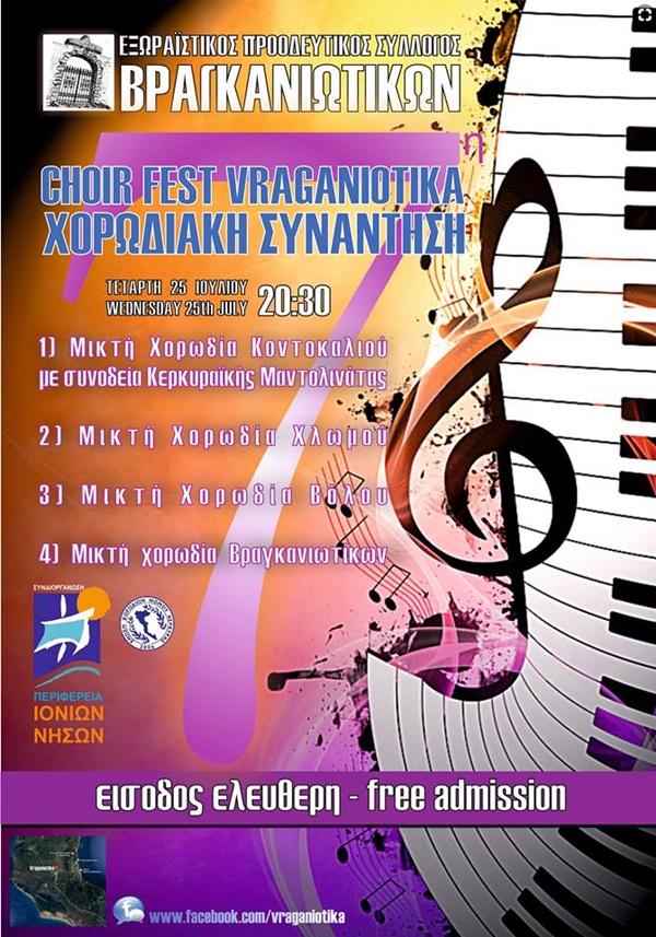Την Τετάρτη 25 Ιουλίου στις 21.00 θα πραγματοποιηθεί η 7η Χορωδιακή Συνάντηση στα Βραγκανιώτικα.
