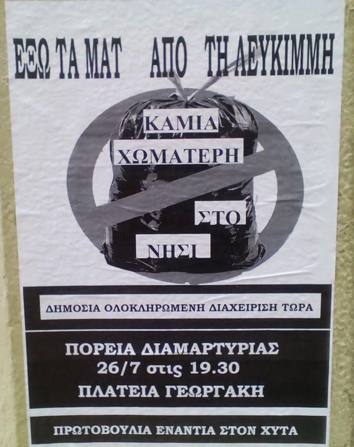 Σήμερα λοιπόν, και ενώ το λαμπρό υπόδειγμα διαχείρισης απορριμμάτων στο Τεμπλόνι είναι γνωστό σε όλους, έρχονται και απαιτούν από την κοινωνία της Λευκίμμης να δεχτεί να γίνει η επόμενη θυσία. Οι Λευκιμμιώτες να δεχτούν το σώριασμα σύμμεικτων σκουπιδιών πάνω στον υδροφόρο ορίζοντα της νότιας Κέρκυρας. Να συναινέσουν στη δηλητηρίαση του νερού τους, που ακόμη αναβλύζει μέσα στο ΧΥΤΑ και σχηματίζει λίμνη. Να παρατήσουν τα χωράφια τους που θα είναι ακατάλληλα για καλλιέργεια. Να συνηθίσουν τη δυσωδία σε απόσταση μερικών εκατοντάδων μέτρων από την τουριστικές δραστηριότητες από τις οποίες βιοπορίζονται. Οι ξεχασμένοι από το κράτος κάτοικοι της Νότιας Κέρκυρας, που δεν έχουν ακόμη ούτε αποχέτευση, πρέπει τώρα να δεχτούν αδιαμαρτύρητα τα σκουπίδια όλης της Κέρκυρας, των μεγάλων all inclusive ξενοδοχειακών μονάδων και όλης της τουριστικής βιομηχανίας του νησιού.