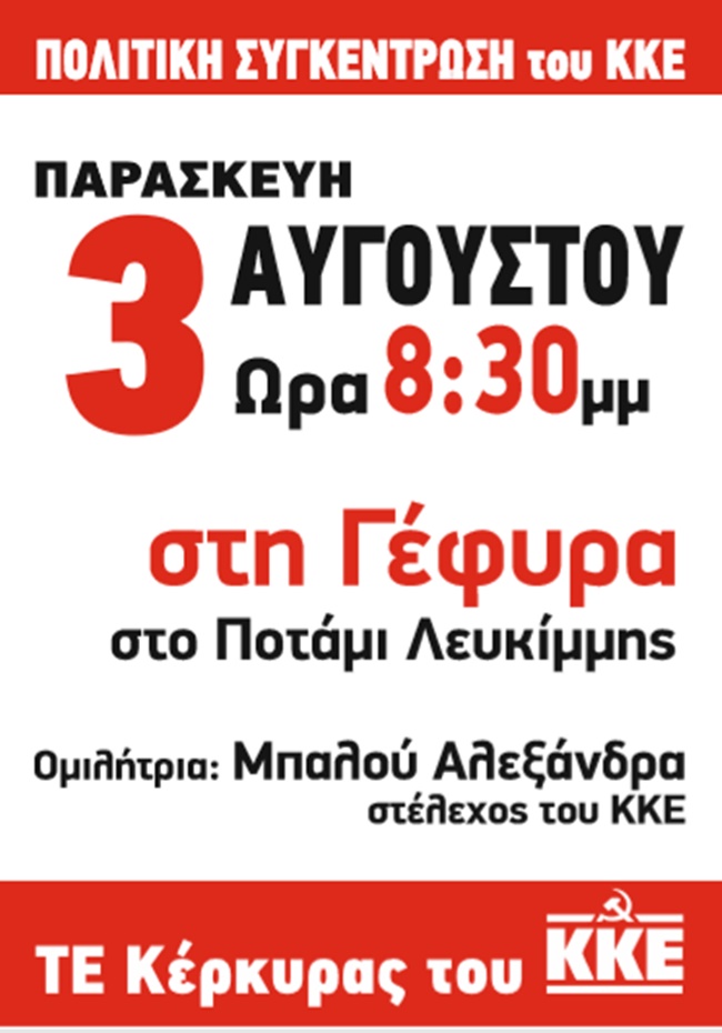 Την Παρασκευή 3 Αυγούστου, στη Γέφυρα του Ποταμιού της Λευκίμμης, το ΚΚΕ θα πραγματοποιήσει πολιτική συγκέντρωση με ομιλία την Αλεξάνδρα Μπαλού.