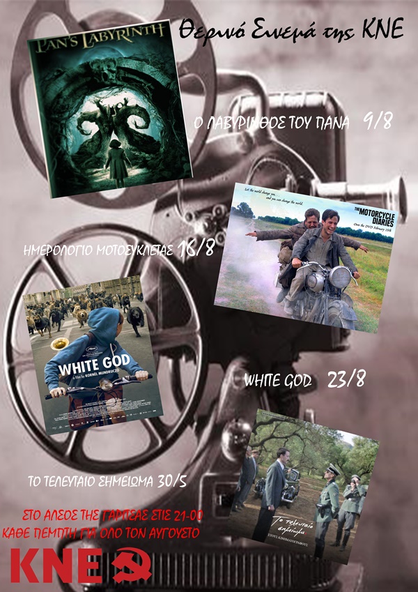 Tο πρόγραμμα των προβολών του θερινού σινεμά που θα πραγματοποιήσει η ΚΝΕ στο Άλσος της Γαρίτσας αυτήν την Πέμπτη και κάθε Πέμπτη του Αυγούστου.