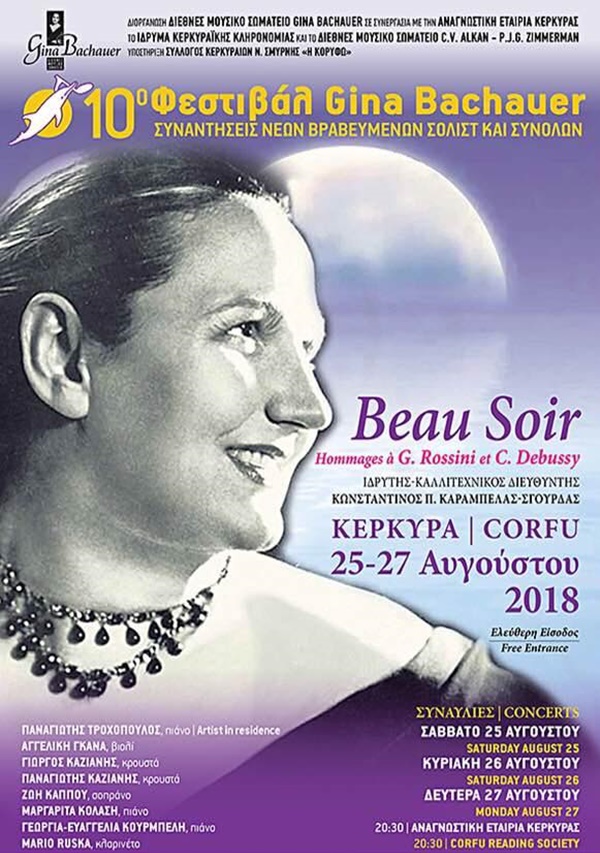Με ιδιαίτερη χαρά παρουσιάζουμε και φέτος το ΦΕΣΤΙΒΑΛ GINA BACHAUER 2018, το οποίο διοργανώνεται από το ΔΙΕΘΝΕΣ ΜΟΥΣΙΚΟ ΣΩΜΑΤΕΙΟ GINA BACHAUER σε συνεργασία με την ΑΝΑΓΝΩΣΤΙΚΗ ΕΤΑΙΡΙΑ ΚΕΡΚΥΡΑΣ, το ΙΔΡΥΜΑ ΚΕΡΚΥΡΑΪΚΗΣ ΚΛΗΡΟΝΟΜΙΑΣ, το ΔΙΕΘΝΕΣ ΜΟΥΣΙΚΟ ΣΩΜΑΤΕΙΟ C.V. ALKAN-P.J.G. ZIMMERMAN και τον ΠΑΝΕΛΛΗΝΙΟ ΜΟΥΣΙΚΟ ΔΙΑΓΩΝΙΣΜΟ ΜΑΡΙΑΣ ΧΑΙΡΟΓΙΩΡΓΟΥ-ΣΙΓΑΡΑ. Οφείλουμε να προσθέσουμε την υποστήριξη του ΣΥΛΛΟΓΟΥ ΚΕΡΚΥΡΑΙΩΝ ΝΕΑΣ ΣΜΥΡΝΗΣ «Η ΚΟΡΥΦΩ», του ΩΔΕΙΟΥ ΚΕΡΚΥΡΑΣ και του ΩΔΕΙΟΥ-ΔΙΕΘΝΟΥΣ ΔΙΑΔΡΑΣΤΙΚΟΥ ΚΕΝΤΡΟΥ ΜΟΥΣΙΚΗΣ, ΤΕΧΝΗΣ, ΠΟΛΙΤΙΣΜΟΥ ΚΑΙ ΕΡΕΥΝΑΣ «ΦΙΛΟΜΟΥΣΙΑ».