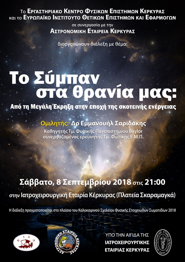 Στο πλαίσιο του Καλοκαιρινού Σχολείου Φυσικής Στοιχειωδών Σωματιδίων 2018, το Εργαστηριακό Κέντρο Φυσικών Επιστημών Κέρκυρας και το Ευρωπαϊκό Ινστιτούτο Θετικών Επιστημών και Εφαρμογών σε συνεργασία με την Αστρονομική Εταιρεία Κέρκυρας διοργανώνουν διάλεξη με θέμα: “ΤΟ ΣΥΜΠΑΝ ΣΤΑ ΘΡΑΝΙΑ ΜΑΣ:Από τη Μεγάλη Έκρηξη στην εποχή της σκοτεινής ενέργειας”