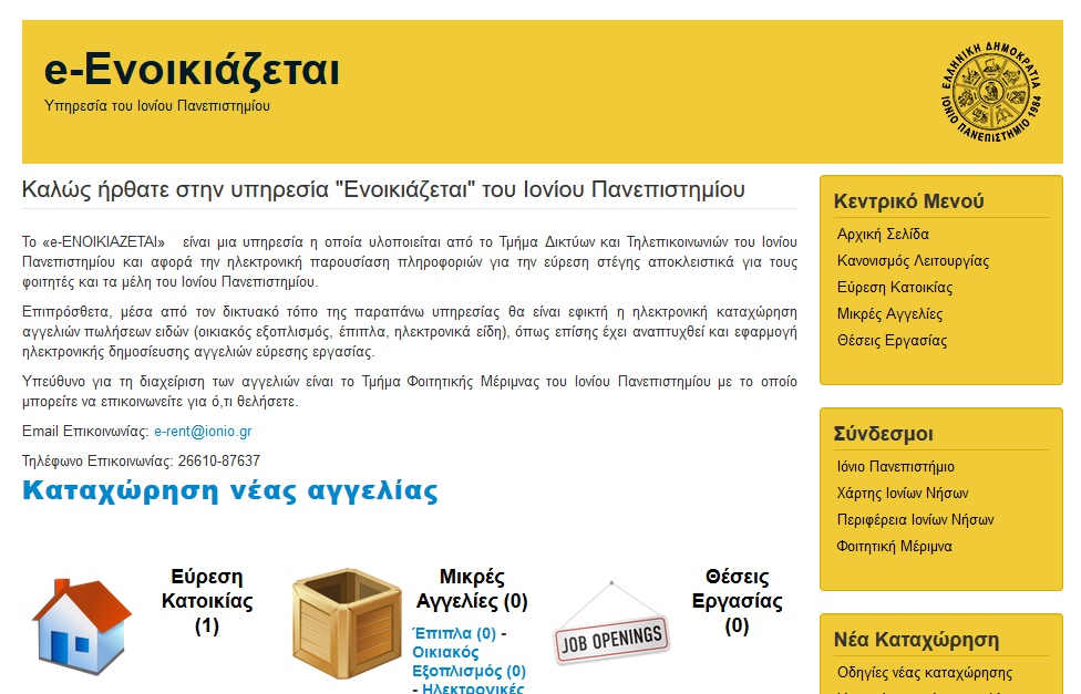 Το Ιόνιο Πανεπιστήμιο, προκειμένου να υποστηρίξει τους φοιτητές του στην ανεύρεση στέγης, αναβάθμισε πλήρως την ψηφιακή του υπηρεσία εύρεσης κατοικίας και μικρών αγγελιών.