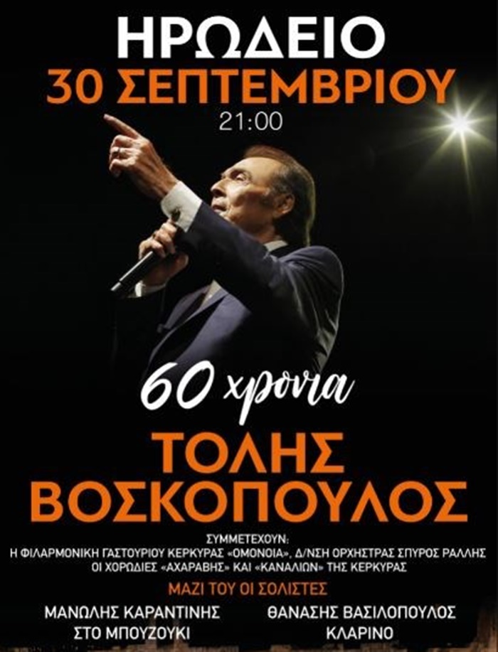 Ανάρπαστα γίνονται τα εισιτήρια για τη μεγάλη συναυλία του Τόλη Βοσκόπουλου στο Ηρώδειο την Κυριακή 30 Σεπτεμβρίου.
