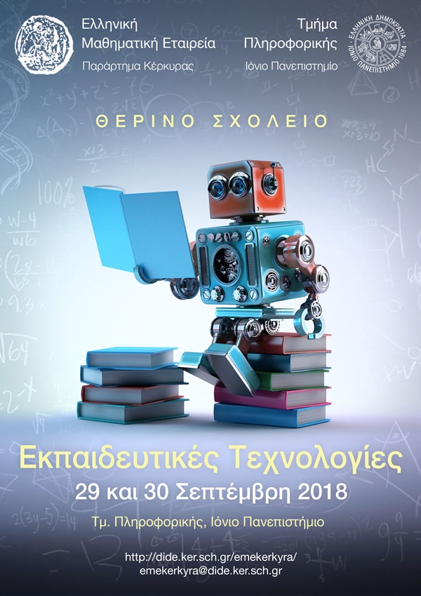 Το παράρτημα Κέρκυρας της Ελληνικής Μαθηματικής Εταιρείας σε συνεργασία με τμήμα Πληροφορικής του Ιονίου Πανεπιστημίου διοργανώνουν διήμερο Θερινό Σχολείο με τίτλο “Εκπαιδευτικές Τεχνολογίες” στις 29 και 30 Σεπτεμβρίου 2018, στην Κέρκυρα.