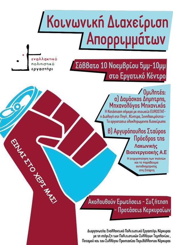 Το Εναλλακτικό Πολιτιστικό Εργαστήρι Κέρκυρας, με την ενεργή υποστήριξη των συλλόγων «Πολιτιστικός Εξωραϊστικός Σύλλογος Τεμπλονίου», «Πολιτιστικός Σύλλογος Ποταμού» και «Σύλλογος Προστασίας Περιβάλλοντος Κέρκυρας» διοργανώνει το Σάββατο 10 Νοεμβρίου 2018 στις 17.00 -22.00 στο Εργατικό Κέντρο Κέρκυρας ομιλία και συζήτηση για όλους τους ενδιαφερόμενους, σχετικά με την “Κοινωνική Διαχείριση Απορριμμάτων”