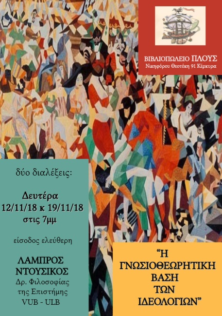 Δύο βραδιές φιλοσοφίας στο βιβλιοπωλείο “Πλους”, με αφορμή τους σύγχρονους προβληματισμούς γύρω από τη δομή, τη θεμελίωση και τη λειτουργία των ιδεολογιών. Μια όμορφη και ουσιαστική αναζήτηση των σημαντικότερων μηχανισμών της σκέψης, που ευθύνονται για την κατασκευή διαφόρων φιλοσοφικών θεωριών. Μια αυτοψία της κοινωνιολογίας της γνώσης και μια εξερεύνηση των βαθύτερων ψυχολογικών κινήτρων του ανθρώπου, έτσι όπως αυτά αποτυπώνονται στις σύγχρονες ιδεολογίες.