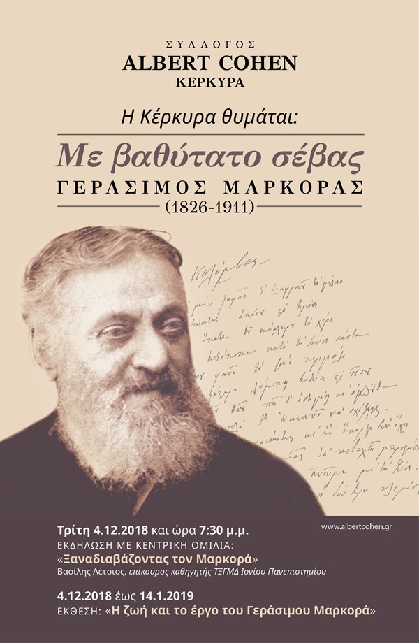 Ο Σύλλογος «Albert Cohen Κέρκυρα» διοργανώνει εκδήλωση-αφιέρωμα στον Κερκυραίο ποιητή Γεράσιμο Μαρκορά, την Τρίτη 4 Δεκεμβρίου 2018, ώρα 19.30, στη Δημόσια Βιβλιοθήκη Κέρκυρας.
