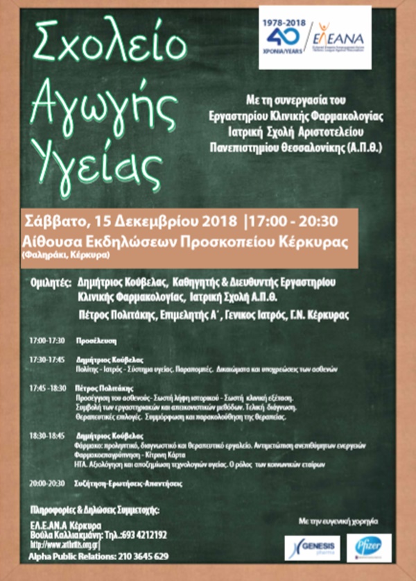 Εκδήλωση ενημέρωσης και ευαισθητοποίησης του κοινού και των επαγγελματιών υγείας, με τίτλο «Σχολείο Αγωγής Υγείας», οργανώνει η Ελληνική Εταιρεία Αντιρευματικού Αγώνα (ΕΛ.Ε.ΑΝ.Α) ,το Σάββατο 15 Δεκεμβρίου 2018 και ώρες 17:00-20:30 στο “Προσκοπείο” (Φαληράκι Κέρκυρας). Η εκδήλωση αυτή πραγματοποιείται με τη συνεργασία του Εργαστηρίου Κλινικής Φαρμακολογίας της Ιατρικής Σχολής Αριστοτελείου Πανεπιστημίου Θεσσαλονίκης (Α.Π.Θ) και την ευγενική χορηγία των εταιρειών Genesis Pharma & Pfizer IGLC (Γραφείο Ανεξάρτητων Επιχορηγήσεων της Pfizer για την εκμάθηση & την αλλαγή).