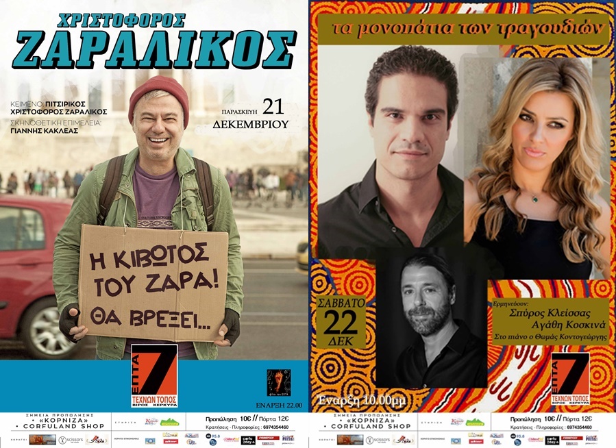 Παρασκευή και Σάββατο θα υπάρξουν παραστάσεις στο Επτά Τεχνών Τόπος. Την Παρασκευή, στη σκηνή του Επτά θα είναι ο Χριστόφορος Ζαραλίκος ενώ το Σάββατο η Αγάθη Κοσκινά και ο Σπύρος Κλείσσας.
