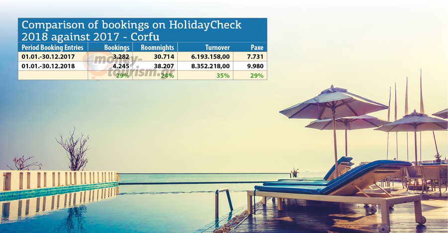 Η Κέρκυρα, πέτυχε το 2018, έσοδα 8,35 εκατ. €, έναντι 6,2 εκατ. το 2017, σημειώνοντας αύξηση 35% (!!!), με αύξηση κρατήσεων 29% στις 4.245 και αύξηση διανυκτερεύσεων 24%, στις 38.207.