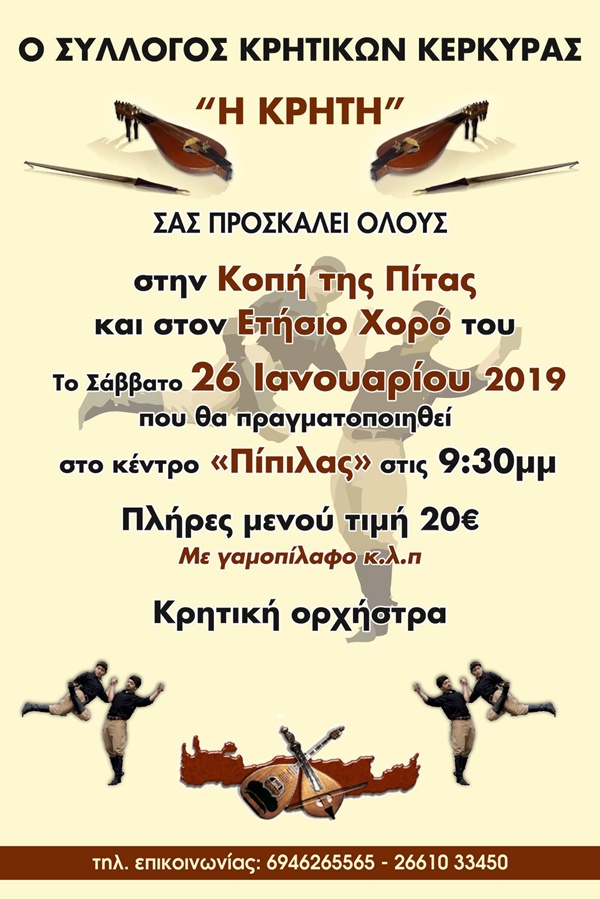 Ο Σύλλογος Κρητικών Κέρκυρας “Η Κρήτη” σας προσκαλεί όλους στην κοπή της πίτας και στον ετήσιο χορό του το Σάββατο 26 Ιανουαρίου 2019 που θα πραγματοποιηθεί στο κέντρο “Πίπιλας” στις 9.30 μ.μ.