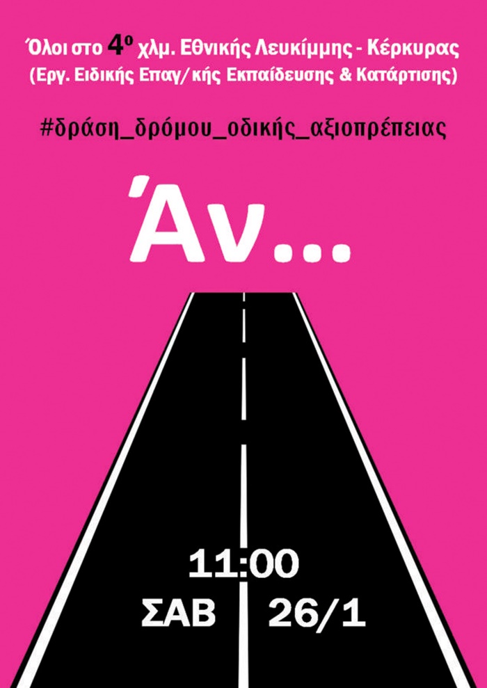Για όλα αυτά τα «Αν…» μια ομάδα πολιτών διοργανώνει μια δράση δρόμου οδικής ασφάλειας στη διάβαση μπροστά από το Εργαστήρι Ειδικής Επαγγελματικής Εκπαίδευσης και Κατάρτισης στο 4ο χλμ. της Εθνικής Οδού Λευκίμμης – Κέρκυρας το επόμενο Σάββατο 26 Γενάρη 2019 στις 11 το πρωί.