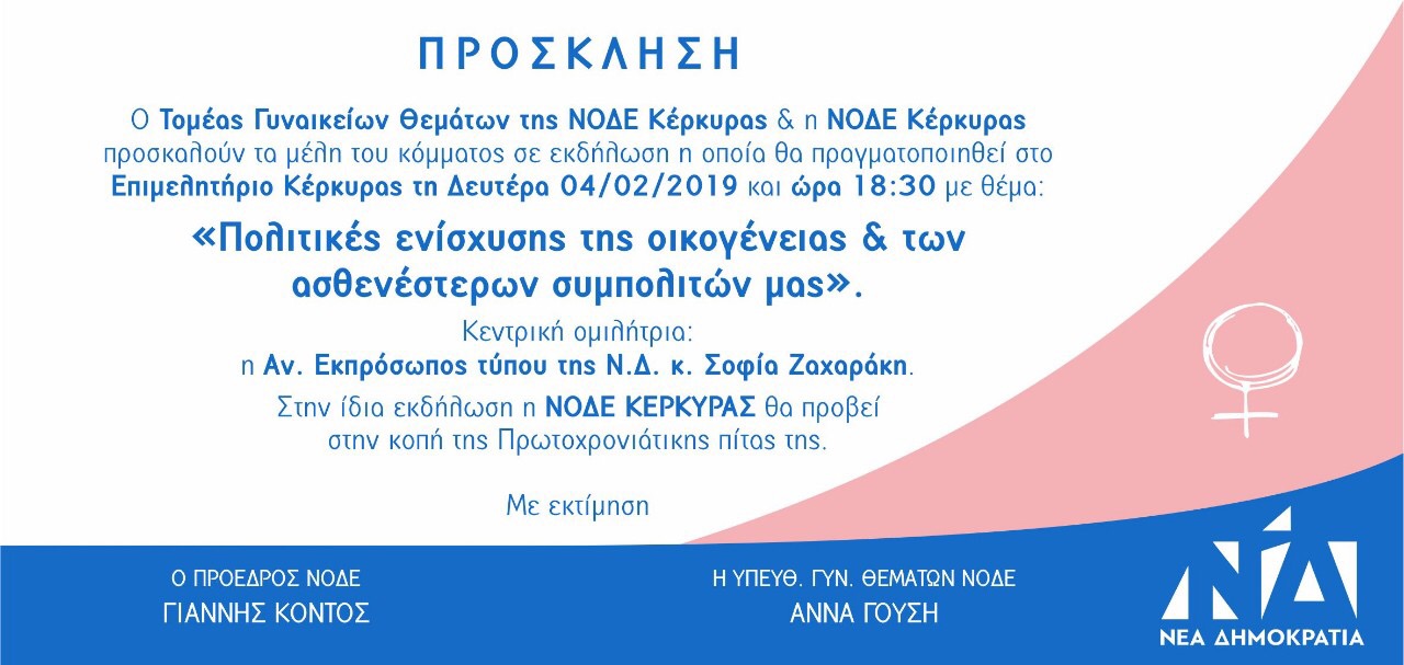 Η ΝΟΔΕ Κέρκυρας ενημερώνει και ΠΡΟΣΚΑΛΕΙ όλα τα μέλη και τους φίλους της ΝΔ σε εκδήλωση του Τομέα Γυναικείων Θεμάτων της ΝΟΔΕ, στο Επιμελητήριο Κέρκυρας, την Δευτέρα 04/02/2019 και ώρα 18:30, με θέμα <<Πολιτικές Ενίσχυσης της Οικογένειας & των ασθενέστερων συμπολιτών μας>> και κεντρική ομιλήτρια την αναπληρώτρια Εκπρόσωπο Τύπου της ΝΔ κ. Σοφία Ζαχαράκη.