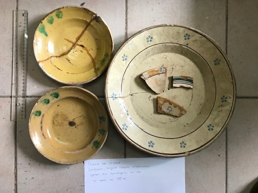 • Τρία (3) ολόκληρα κεραμικά εφυαλωμένα πινάκια και τρία (3) όστρακα αντίστοιχων πινακίων Μεταβυζαντινών χρόνων, χρονολογείται έως και τις αρχές του 19ου αιώνα