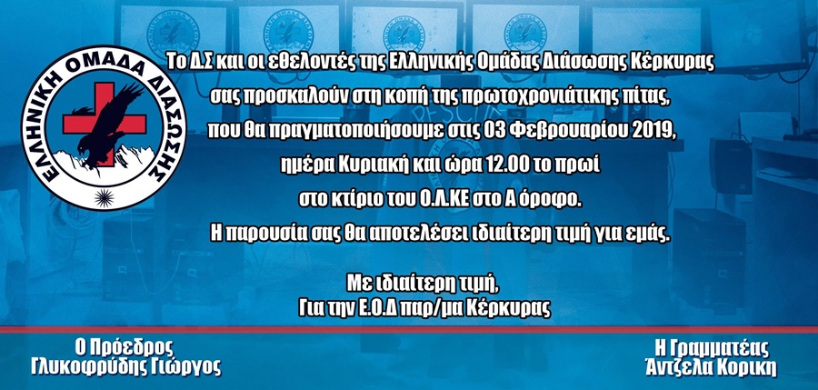 Το ΔΣ και οι εθελοντές της Ελληνικής Ομάδας Διάσωσης Κέρκυρας σας προσκαλούν στην κοπή της πρωτοχρονιάτικης πίτας που θα πραγματοποιήσουμε στις 3 Φεβρουαρίου, ημέρα Κυριακή και ώρα 12.00 το πρωί στο κτίριο του ΟΛΚΕ στον α’ όροφο.