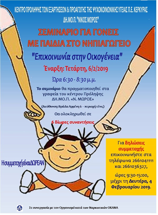 Το Κέντρο Πρόληψης των εξαρτήσεων και Προαγωγής της Ψυχοκοινωνικής Υγείας Π.Ε. Κέρκυρας, ΔΗ.ΜΟ.Π. «Νίκος Μώρος», στα πλαίσια των προγραμμάτων ενημέρωσης και ευαισθητοποίησης για γονείς, διοργανώνει ομάδα για γονείς νηπίων με θέμα: