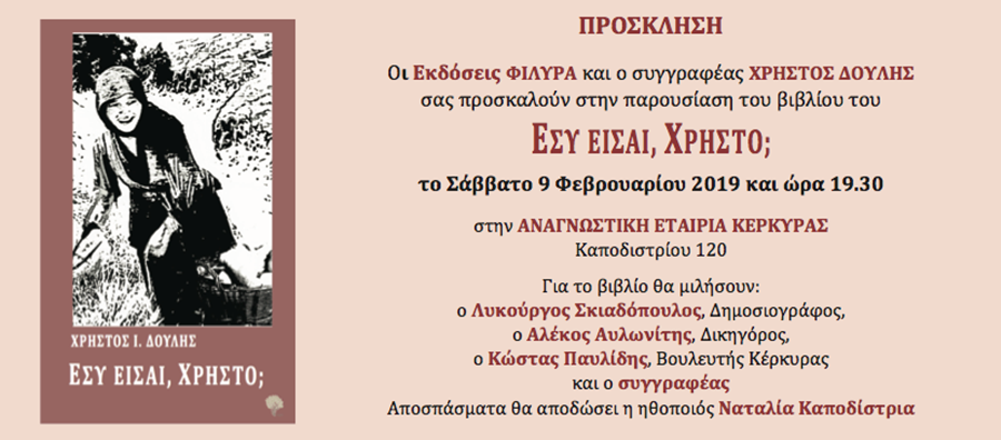 Οι εκδόσεις Φιλύρα και ο συγγραφέας Χρήστος Δούλης διοργανώνουν την παρουσίαση του βιβλίου “ΕΣΥ ΕΙΣΑΙ, ΧΡΗΣΤΟ;”