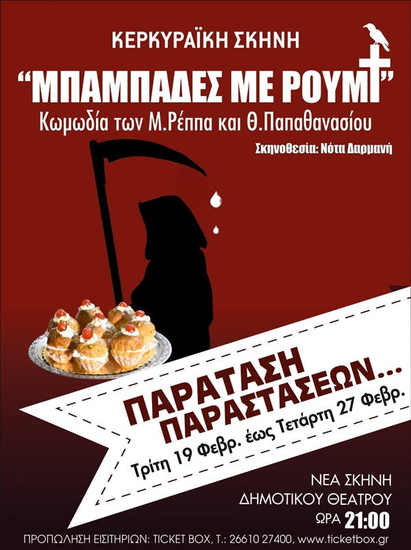 Η Κερκυραϊκή Σκηνή μετά την πολύ θερμή ανταπόκριση του κοινού παρατείνει τις ημέρες των παραστάσεων του έργου των Μ. Ρέππα και Θ. Παπαθανασίου «Μπαμπάδες με ρούμι», από την Τρίτη 19 Φεβρουαρίου έως και την Τετάρτη 27 Φεβρουαρίου στη Νέα Σκηνή του Δημοτικού Θεάτρου στις 21:00.
