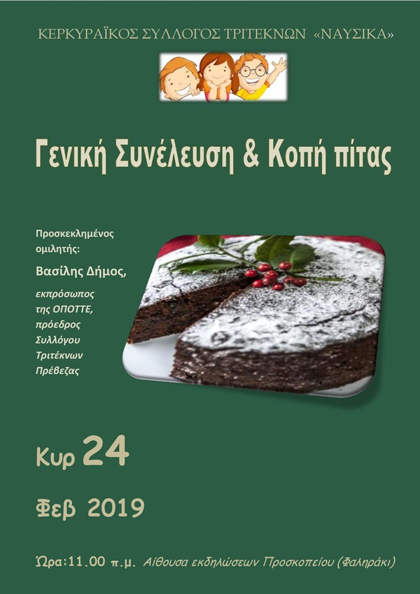 O Κερκυραϊκός Συλλόγος Τριτέκνων «Ναυσικά» θα πραγματοποιήσει την κοπή πίτας του, την Κυριακή 24 Φεβρουαρίου και ώρα 11:00 στην αίθουσα εκδηλώσεων στο Προσκοπείο.