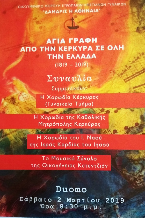Στη συναυλία συμμετέχουν η Χορωδία Κέρκυρας (γυναικείο τμήμα), η Χορωδία της Καθολικής Μητρόπολης Κέρκυρας, η Χορωδία του Ι. Ναού της Ιεράς Καρδίας του Ιησού και το Μουσικό σύνολο της Οικογένειας Κετεντζιάν.