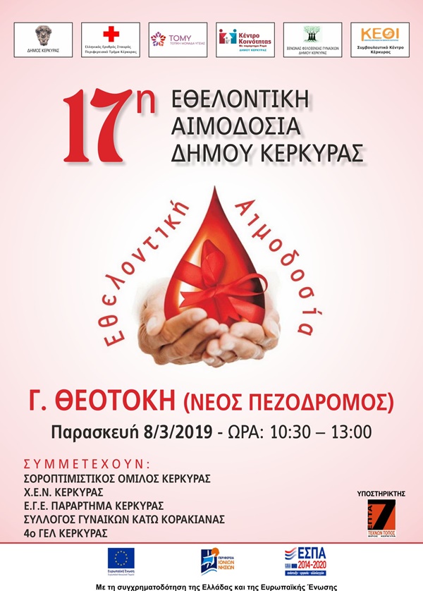 Στα πλαίσια εορτασμού της Παγκόσμιας Ημέρας της Γυναίκας, η Επιτροπή Τράπεζας Αίματος του Δήμου Κέρκυρας με συνδιοργανωτές τον Ελληνικό Ερυθρό Σταυρό-Παράρτημα Κέρκυρας, την ΤΟΜΥ (Τοπική Μονάδα Υγείας) Κέρκυρας, το Συμβουλευτικό Κέντρο Κέρκυρας, το Κέντρο Κοινότητας Δήμου Κέρκυρας, τον Ξενώνα Φιλοξενίας Δήμου Κέρκυρας και τη Δημοτική Επιτροπή Ισότητας των Φύλων του Δήμου Κέρκυρας θα πραγματοποιήσουν εθελοντική αιμοδοσία την Παρασκευή 08 Μαρτίου 2019, επί της οδού Γεωργίου Θεοτόκη (νέος πεζόδρομος), από 10.30 – 13.00.
