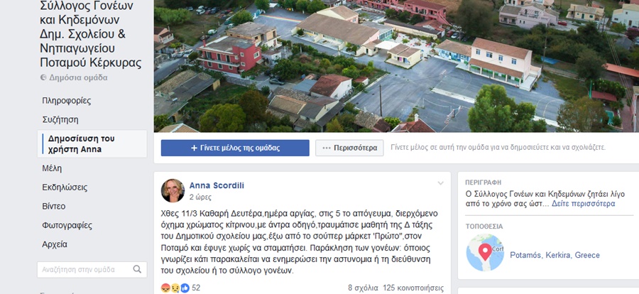 Πιο συγκεκριμένα, η κ. Άννα Σκορδίλη αναφέρει στη σελίδα πως “χθες 11/3 Καθαρή Δευτέρα,ημέρα αργίας, στις 5 το απόγευμα, διερχόμενο όχημα χρώματος κίτρινου,με άντρα οδηγό,τραυμάτισε μαθητή της Δ τάξης του Δημοτικού σχολείου μας,έξω από το σούπερ μάρκετ ‘Πρώτο”, τον Ποταμό και έφυγε χωρίς να σταματήσει. Παράκληση των γονέων: όποιος γνωρίζει κάτι παρακαλείται να ενημερώσει την αστυνομια ή τη διεύθυνση του σχολείου ή το σύλλογο γονέων.”