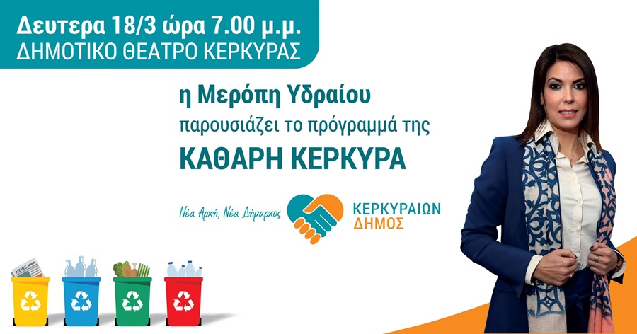 Στις 7 το απόγευμα στο Δημοτικό Θέατρο, σε μια ανοιχτή και μαζική συγκέντρωση πολιτών ,η υπ.Δήμαρχος Μερόπη Υδραίου παρουσιάζει το πρόγραμμά της για το Νέο Δήμο και την Καθαρή Κέρκυρα.