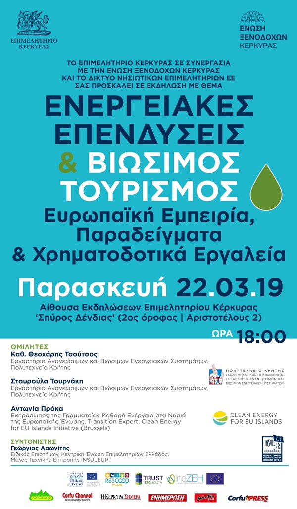 Το Επιμελητήριο Κέρκυρας σε συνεργασία με την Ένωση Ξενοδόχων Κέρκυρας και το Δίκτυο Νησιωτικών Επιμελητηρίων της Ευρωπαϊκής Ένωσης διοργανώνει ανοικτή ενημερωτική εκδήλωση με θέμα: «Ενεργειακές επενδύσεις και βιώσιμος τουρισμός Ευρωπαϊκή εμπειρία, παραδείγματα και χρηματοδοτικά εργαλεία», που θα πραγματοποιηθεί την Παρασκευή 22 Μαρτίου 2019 και ώρα 18:00 στην Αίθουσα εκδηλώσεων του Επιμελητηρίου Κέρκυρας ‘Σπύρος Δένδιας’ 2ος όροφος, Αριστοτέλους 2.