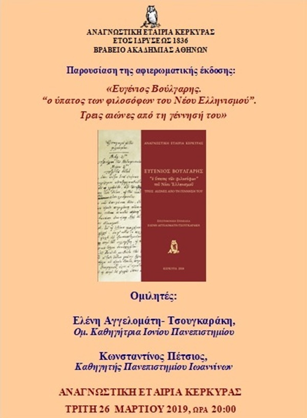 Η Διοικητική Επιτροπή της Αναγνωστικής Εταιρίας Κερκύρας διοργανώνει την παρουσίαση της νέας της έκδοσης, «Ευγένιος Βούλγαρης ο ύπατος των φιλοσόφων του Νέου Ελληνισμού».