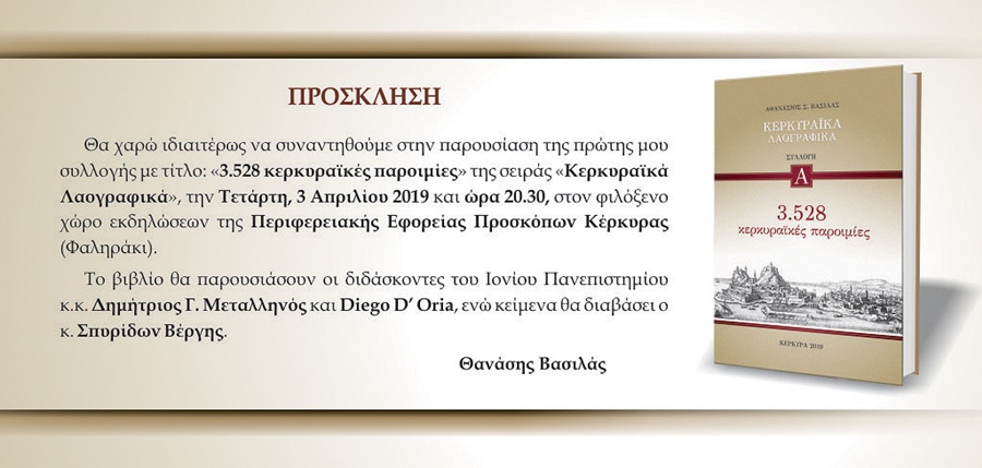 Την Τετάρτη 3 Απριλίου (20:30) θα γίνει η παρουσίαση της πρώτης συλλογής του Αθανασίου Βασιλά με τίτλο: «3.528 Κερκυραϊκές Παροιμίες» της σειράς «Κερκυραϊκά Λαογραφικά».