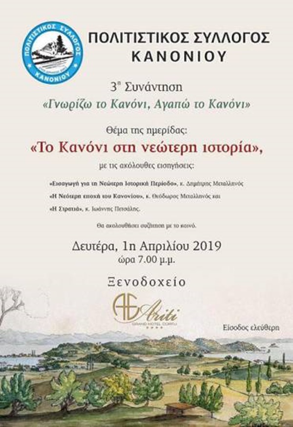 Ο Πολιτιστικός Σύλλογος Κανονιού διοργανώνει την 3η συνάντηση “Γνωρίζω το Κανόνι, Αγαπώ το Κανόνι” την Δευτέρα 1η Απριλίου και ώρα 7.00μμ στο Ξενοδοχείο Ariti.