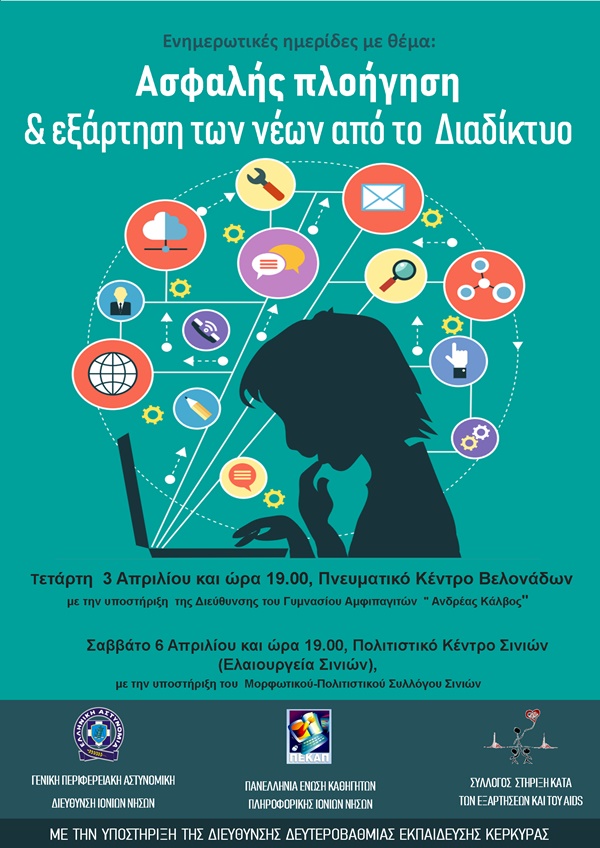 Δύο ακόμη ενημερωτικές ημερίδες πρόκειται να πραγματοποιηθούν από την Γενική Περιφερειακή Αστυνομική Διεύθυνση Ιονίων Νήσων, την Πανελλήνια Ένωση Καθηγητών Πληροφορικής Ιονίων Νήσων (ΠΕΚΑΠ) και τον Σύλλογο Στήριξη κατά των Εξαρτήσεων και του AIDS, με θέμα «Ασφαλής πλοήγηση και εξάρτηση των νέων από το διαδίκτυο».