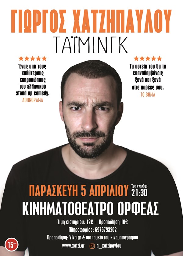 Ο Γιώργος Χατζηπαύλου έρχεται στις 5 Απριλίου, στην Κέρκυρα. Για μία μόνο βραδιά, θα βρεθεί στο κινηματοθέατρο Ορφέας, παρουσιάζοντας την ολοκαίνουρια stand-up comedy παράσταση του με τίτλο «Τάιμινγκ».