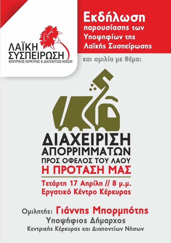 Την Τετάρτη 17 Απριλίου στις 20:00 η Τ.Ε. Κέρκυρας θα πραγματοποιήσει εκδήλωση στο Εργατικό Κέντρο με θέμα «Διαχείριση Απορριμμάτων προς όφελος του λαού – η πρόταση μας» με ομιλητή το Γιάννη Μπορμπότη, υποψήφιο δήμαρχο Κεντρικής Κέρκυρας και Διαποντίων Νήσων. Στη συνέχεια θα ακολουθήσει παρουσίαση των υποψηφίων της Λαϊκής Συσπείρωσης.