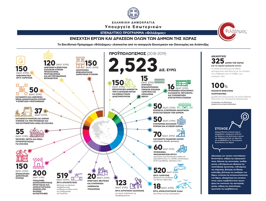 Νέες εντάξεις οι οποίες αφορούν την υλοποίηση έργων σε όλη τη χώρα, με βάση το πρόγραμμα “Φιλόδημος I” του Υπουργείου Εσωτερικών στους τομείς της ύδρευσης, της αποχέτευσης, της αντιπλημμυρικής προστασίας, της αγροτικής οδοποιίας και της ανέγερσης και επανάχρησης δημοτικών κτιρίων, για την κάλυψη βασικών αναγκών (κατασκευή νέων σχολικών συγκροτημάτων, προσθήκη αιθουσών διδασκαλίας κ.ά.).