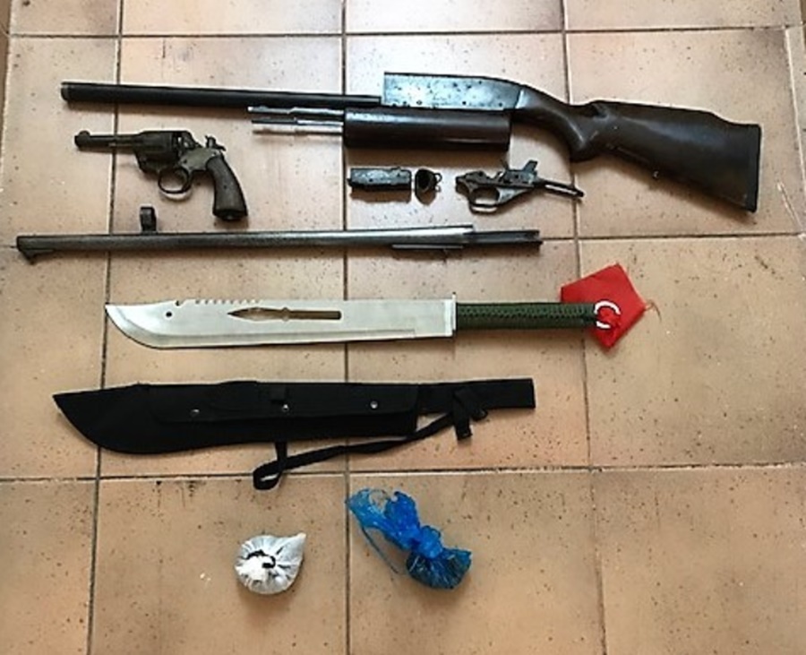 Επίσης, στην Λευκάδα αστυνομικοί του Τμήματος Ασφαλείας σε συνεργασία με αστυνομικούς του Αστυνομικού Τμήματος Ελλομένου, συνέλαβαν το απόγευμα της Μ.Τρίτης (23-04-2019), έναν 26χρονο ημεδαπό διότι κατά την διάρκεια αστυνομικών ερευνών στην οικία του, παρουσία δικαστικού λειτουργού, βρέθηκαν παράνομα στην κατοχή του ακατέργαστη κάνναβη βάρους (42) γραμμαρίων περίπου, ένα σπαθί, ένα περίστροφο και ένα κυνηγητικό όπλο.
