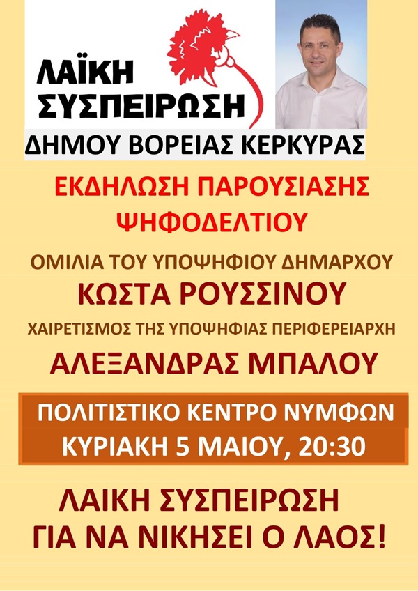 Η ΛΑΪΚΗ ΣΥΣΠΕΙΡΩΣΗ Δήμου Βόρειας Κέρκυρας σας προσκαλεί στην Εκδήλωση Παρουσίασης του Ψηφοδελτίου της, η οποία θα πραγματοποιηθεί την Κυριακή 5 Μαΐου στις 20:30 στο Πολιτιστικό Κέντρο Νυμφών. Στην εκδήλωση θα μιλήσει ο Υποψήφιος Δήμαρχος Κώστας Ρούσσινος και θα χαιρετήσει η Υποψήφια Περιφερειάρχης Αλεξάνδρα Μπαλού.