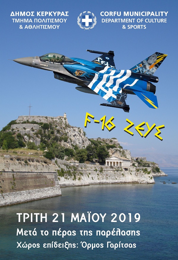 Σας ενημερώνουμε ότι την Τρίτη 21 Μαΐου, μετά το πέρας της παρέλασης και στο πλαίσιο των εορταστικών εκδηλώσεων για την Ένωση της Επτανήσου με την Ελλάδα, το αεροσκάφος της Ομάδας F – 16 «ΖΕΥΣ» της Πολεμικής Αεροπορίας θα εκτελέσει αεροπορική επίδειξη στον όρμο της Γαρίτσας.