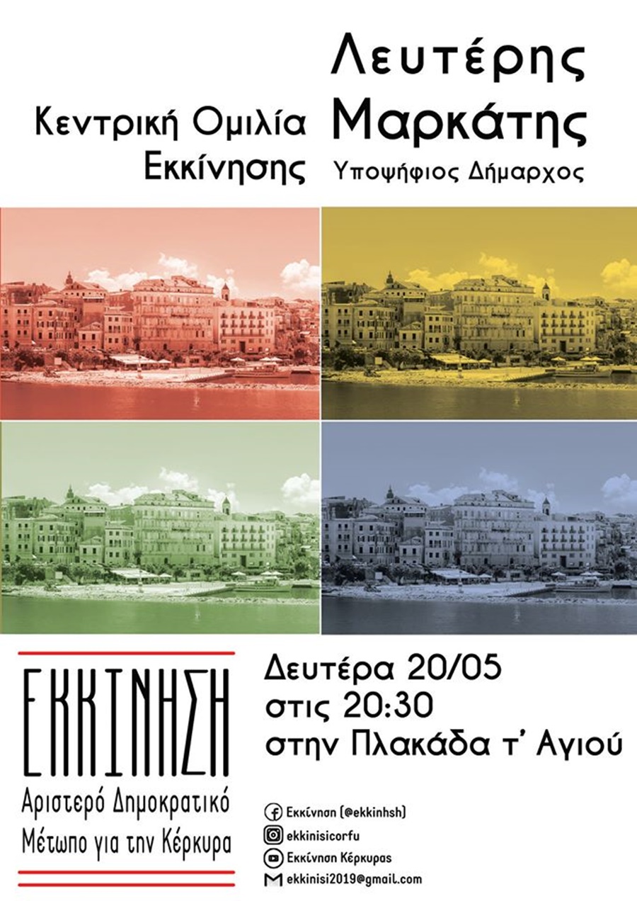 Τη Δευτέρα 20 Μαΐου και ώρα 20:30 στην Πλακάδα του Αγίου, θα πραγματοποιηθεί η κεντρική προεκλογική εκδήλωση της Εκκίνησης με βασικό ομιλητή, τον επικεφαλής της Λευτέρη Μαρκάτη.