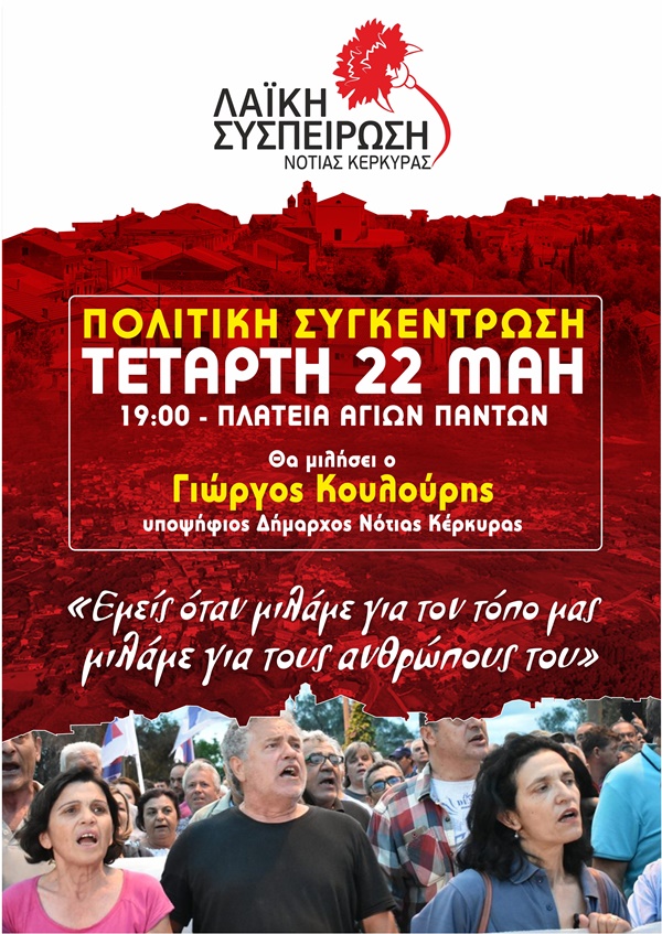 Η Λαϊκή Συσπείρωση Νότιας Κέρκυρας διοργανώνει πολιτική συγκέντρωση την Τετάρτη 22/5 στην Πλατεία Αγίων Πάντων στη Λευκίμμη στις 20:00.