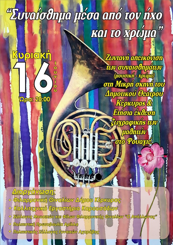 Μία προσπάθεια ταυτόχρονης ηχητικής και χρωματικής απεικόνισης των συναισθημάτων θα πραγματοποιήσουν τη Κυριακή 16 Ιουνίου, ώρα 20:00 το καλλιτεχνικό εργαστήρι της Δήμητρας Κληρονόμου, η Φιλαρμονική Θιναλίων και τα τμήματα ζωγραφικής των Πολιτιστικών συλλόγων Αρίλλα και Αχαράβης στη Μικρή Σκηνή του Δημοτικού Θεάτρου Κέρκυρας.