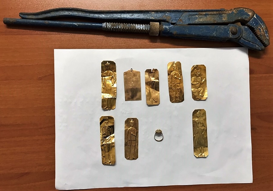 Στο πλαίσιο της έρευνας βρέθηκαν στην κατοχή του και κατασχέθηκαν οκτώ (8) χρυσά τάματα και ένα δαχτυλίδι, που είχε αφαιρέσει από τον Ιερό Ναό, τα οποία και επιστράφηκαν στον ιερέα του ναού.
